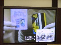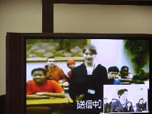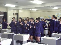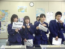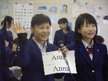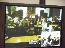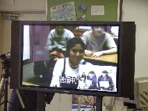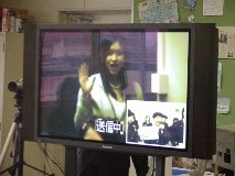 We had the third Video Conference with Von Steuben HS in Chicago, USA at 7:30 - 8:30 on November 21st Japan time, at 16:30 - 17:30 on November 20th Chicago time. It was planed in May. But Chicago took SUMMER TIME and the time difference became to be one hour bigger and it was too hard for both of students to come up to school and go back home So we decided to have this video conference in November. Class1-6 takes The "Chopsticks & Forks" project which class1-6, 2002 worked, and have been exchanging e-mails with their partner since October. They had introduction with face to face and voice to voice this time. At 7:20, it was ringing from Chicago and succeeded to connect. There are no students at Chicago side, and here are a few boy students. After teachers' greeting, our students began to talk to Chicago teacher. At 7:30, both of students came together at room and started the Video Conference. (Takashi, student leader emailed teachers at Chicago before this and he discussed and decided what we did in conference) 1) Self-Introduction by class1-6 Each student with card written own name and partner's name stood in front of camera group by group and they saw their partners on the screen. (That was a moment of getting tense , but also getting impression) They were waving big (and threw kiss) partner to partner, but they were disappointed when their partner was absent on both side.